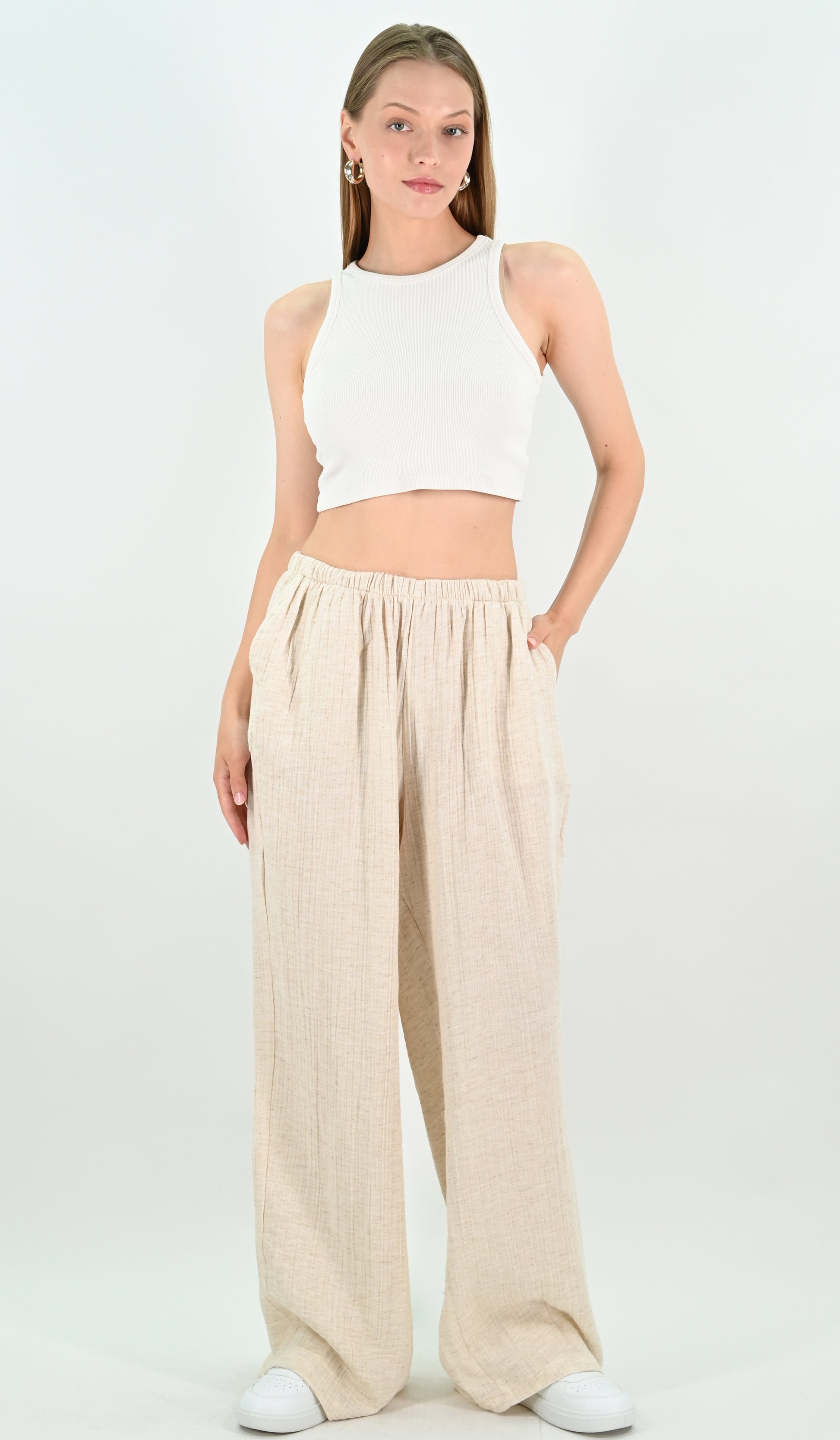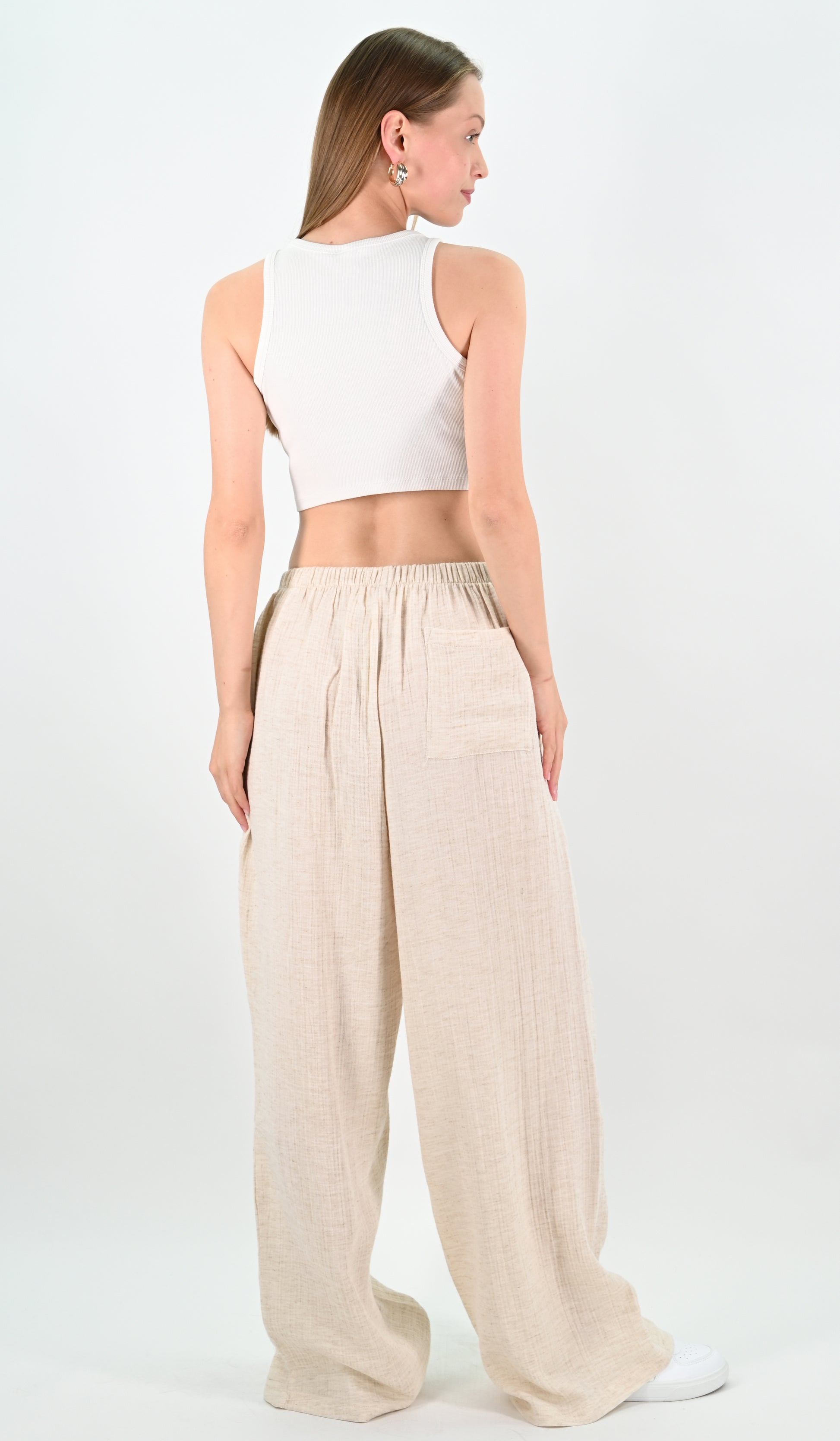 These beige wide-leg trousers crafted from a linen blend offer a refined balance of comfort and structure. The breathable fabric ensures all-day wearability, while the wide-leg cut provides a modern silhouette that flatters various body types. Ideal for both professional and casual settings, these trousers combine timeless style with practical ease.